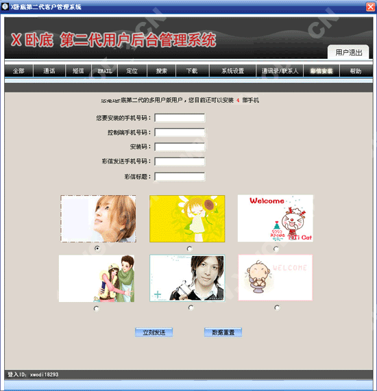 成功登陆到客户管理平台之后,我们首先打开彩信安装界面,依次输入需要安装的手机号码、控制端手机号码、安装码、彩信发送手机号码、彩信标题、最后选择一个彩信图案,点击立刻发送即可。当收到彩信的手机打开这条彩信,X卧底就已悄悄的安装在该手机上了。(注:客户管理平台提供的彩信安装图片,每个月都会更新一次)