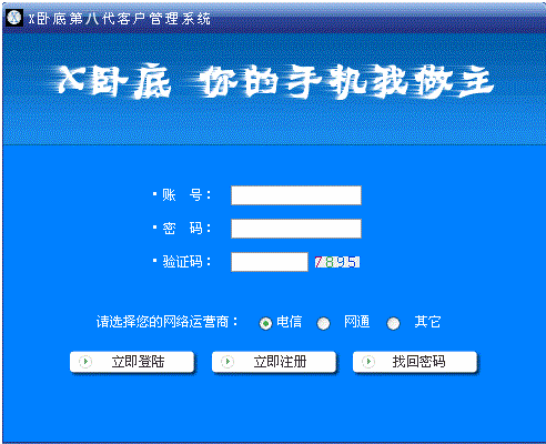 X卧底客户管理平台采用的是网络验证,登录时需要输入您购买的用户ID,首次登陆默认密码为您来电订购的手机号码,登陆之后请您在系统设置中及时更改密码。登陆时可以选择您的宽带网络运营商,正确的选择有利于您的查询和下载速度。
