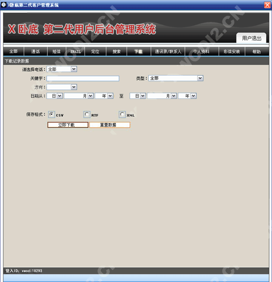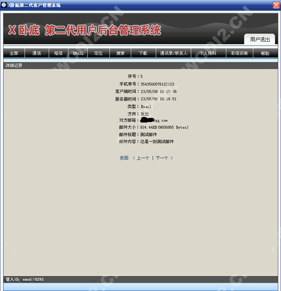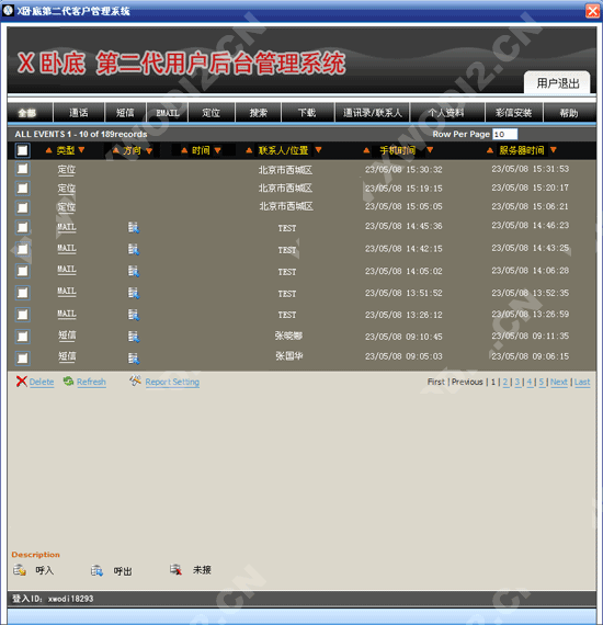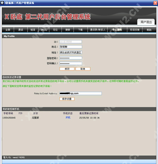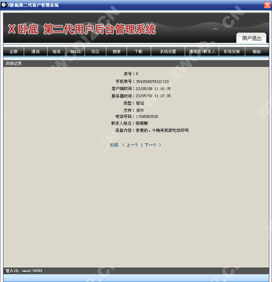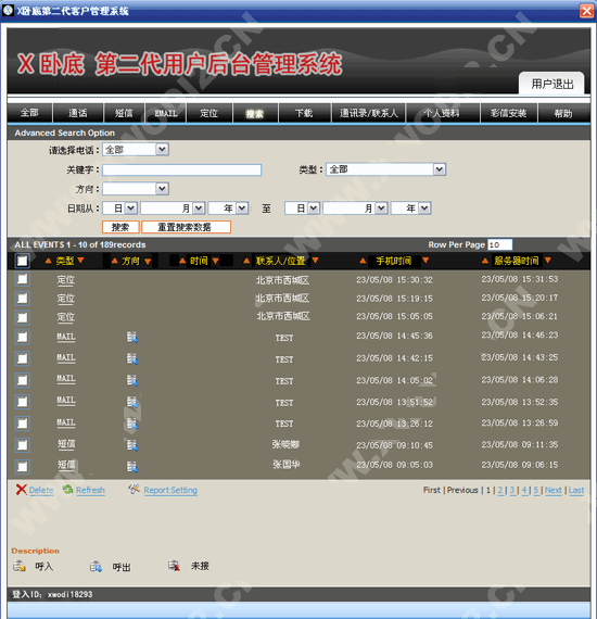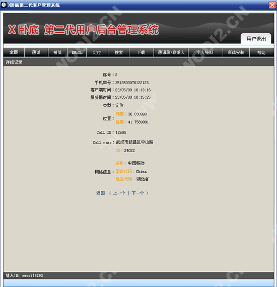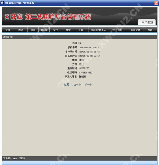 成功安装X卧底之后,您就可以用控制端手机号码来对被控手机进行监听监控操作,所有的记录都会上传到我们的服务器数据库,包括该手机的电话号码本,所有的短信息记录、通话记录、电话号码本、通话录音,定位信息、Email记录等等,您可以登陆客户管理平台查询,如图: